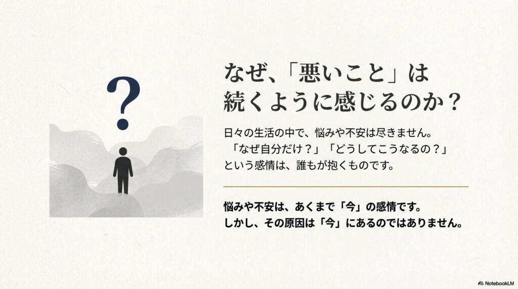 悩みや不安というものは、「今」の自分の感情や思考に出てくるものです。