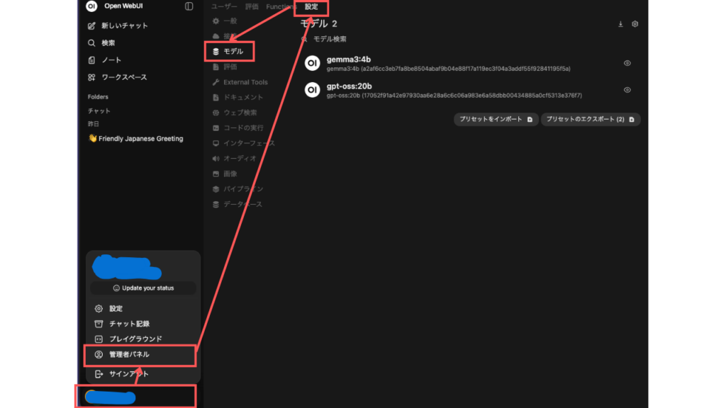 まずは、Open WebUIでのモデル管理画面までの行き方を。