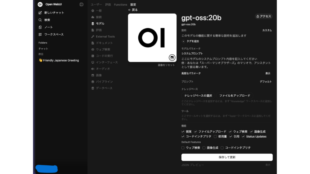 | 機能 | モデルに許可する操作を設定 ◯視覚:画像分析機能のON・OFF ◯ファイルのアップロード: ユーザーがモデルにファイルをアップロードできるようにする。 ◯コードインタプリタ:Pythonコード実行のON・OFF ◯画像生成:画像生成の統合のON・OFF ◯使用状況/引用:使用状況の追跡またはソースの引用を切り替える ◯Status Updates:生成中に進捗状況を表示する |