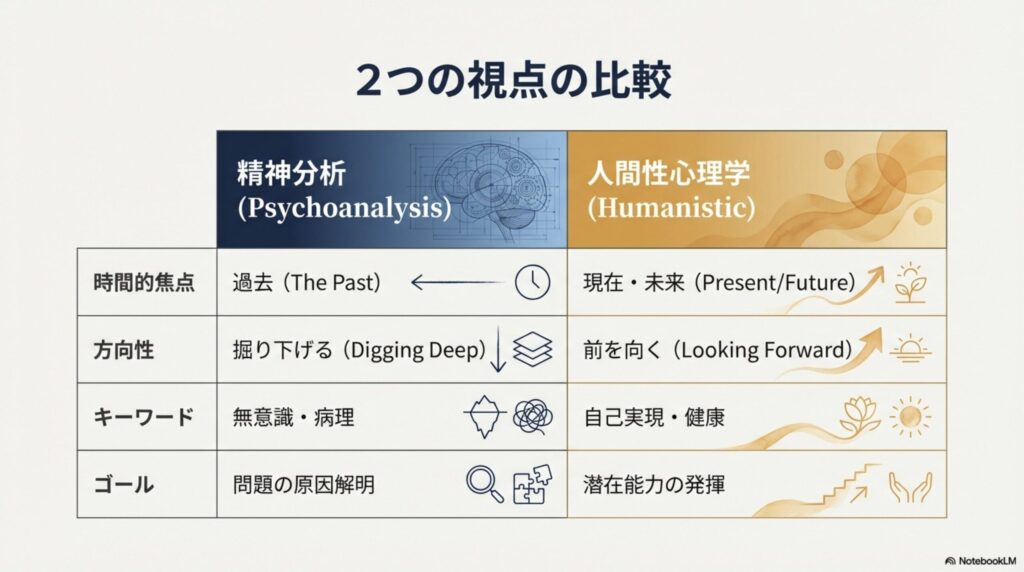 精神分析は、過去に焦点をあて、自分を掘り下げることで問題を見つめます。