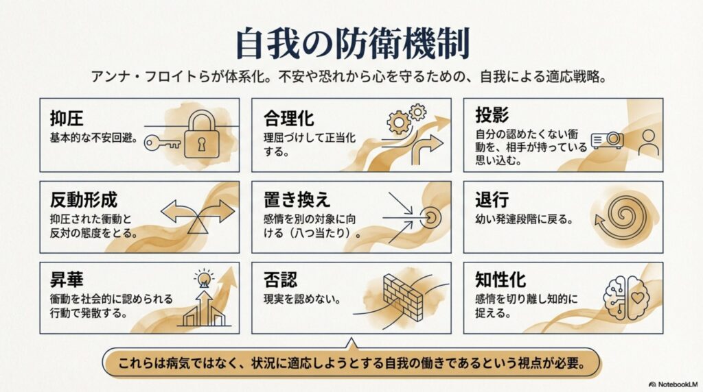 実際に、イド(エス)の衝動を超自我が抑え込み、自我がバランスを取る方法をアンナ・フロイトやクラインが体系化しています。
