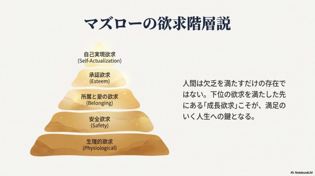 一つずつ段階的に満たし、⑤を満たすことができれば、満足の行く人生を送ることができる。