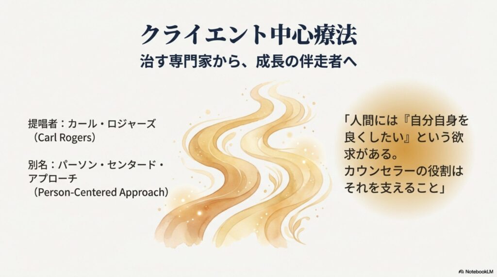 それを支えるのがカウンセラーの役割であると、「治す専門家」ではなく「成長の伴走者」としての転換を唱えたのが、ロジャーズです。