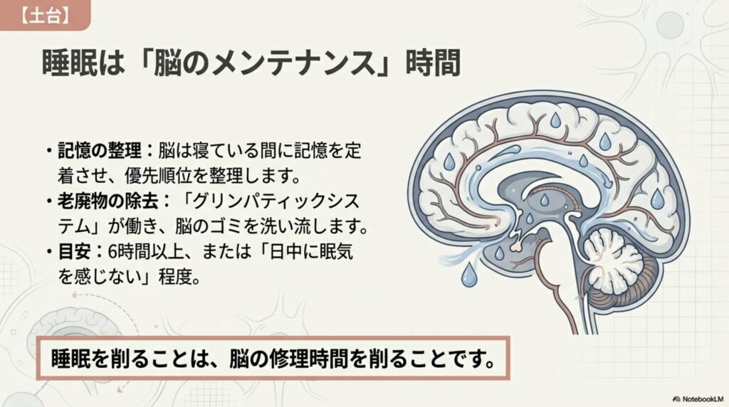 十分に脳を働かせるために、睡眠は削ってはいけないのです。