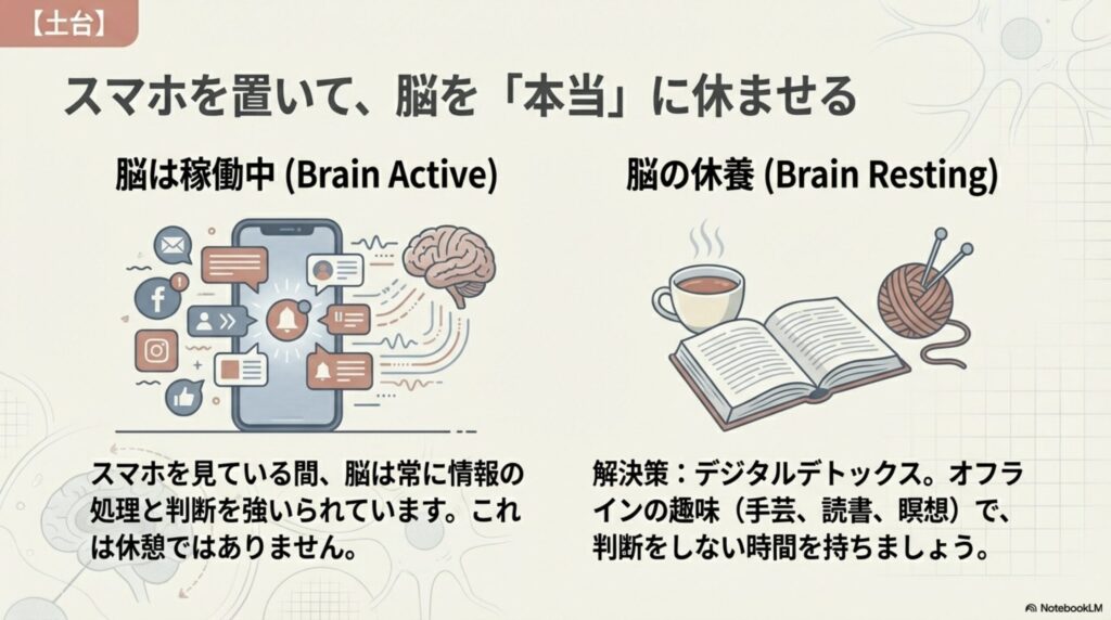 身体を休めても疲れがとれた気がしないのは、脳が働いてしまっているからです。