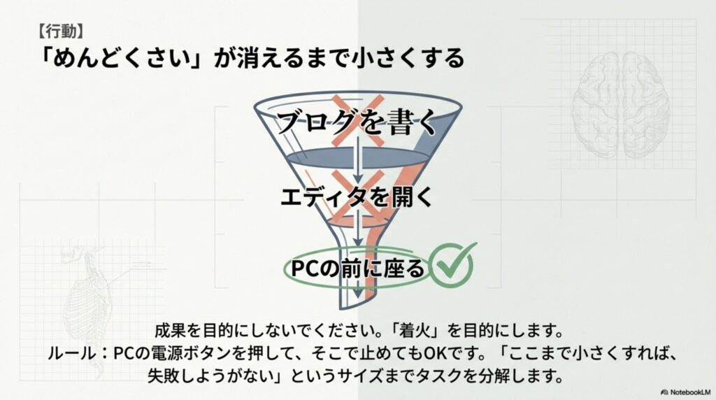 「ブログを書く」のであれば、「パソコンの電源を入れる」でも良いでしょうし、「机に向かう」だけでも良いでしょう。