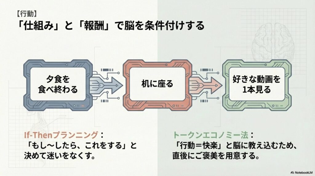 「if-thenプランニング」と言われるものだと後から知りましたが、「〇〇したら□□をする」という仕組みを作ってしまうことです。ルールとも言えますね。
