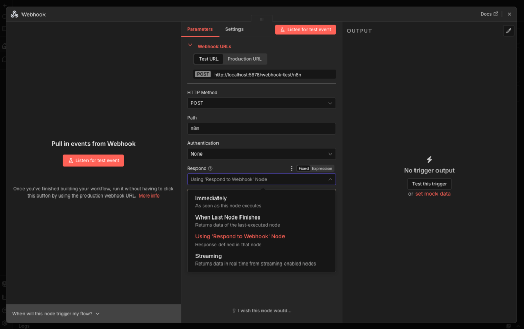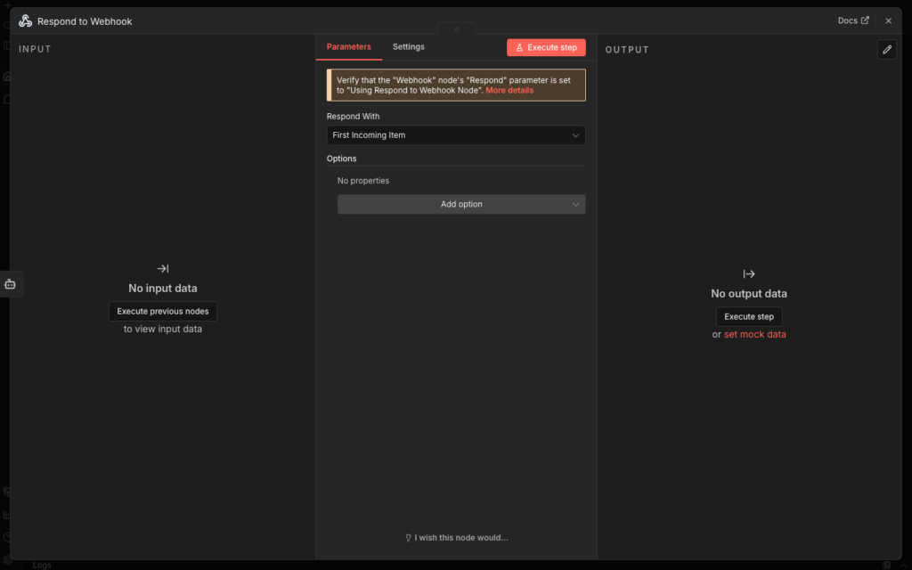 リクエスト完了後にOpen WebUIにデータを送る場合は、「Respond」を「Using 'Respond to Webhook’ Node」にするみたいです。