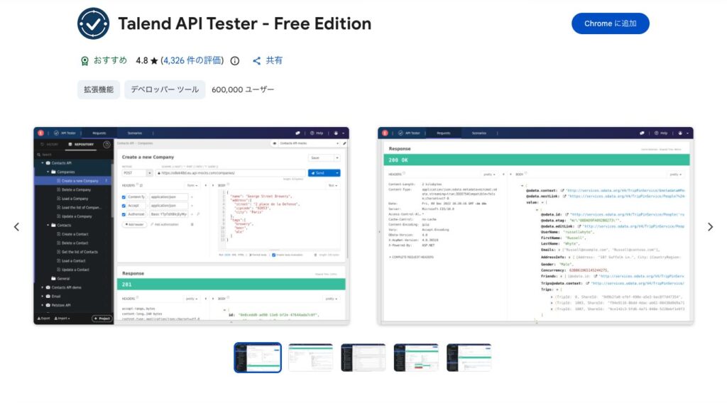「Talend API tester」の右にJSONデータを入力後、「Send」を押すと受け取ってくれるようになります。