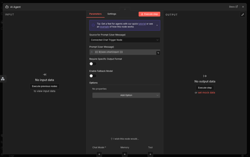Open WebUIに入力したプロンプトを受け取るので、JSON形式で受け取るように「{{ $json.body.chatInput }}」を入力。